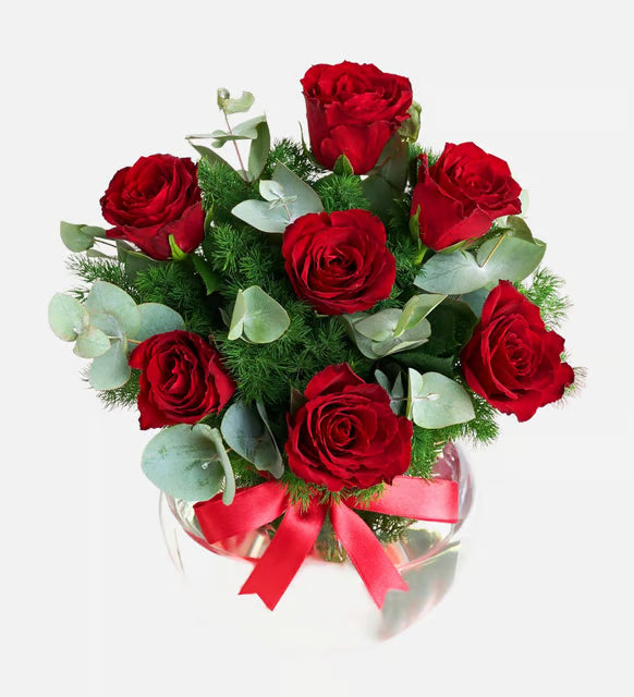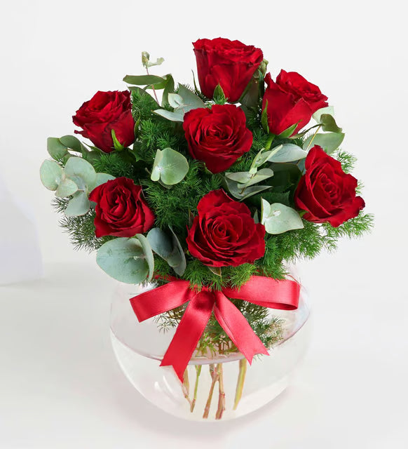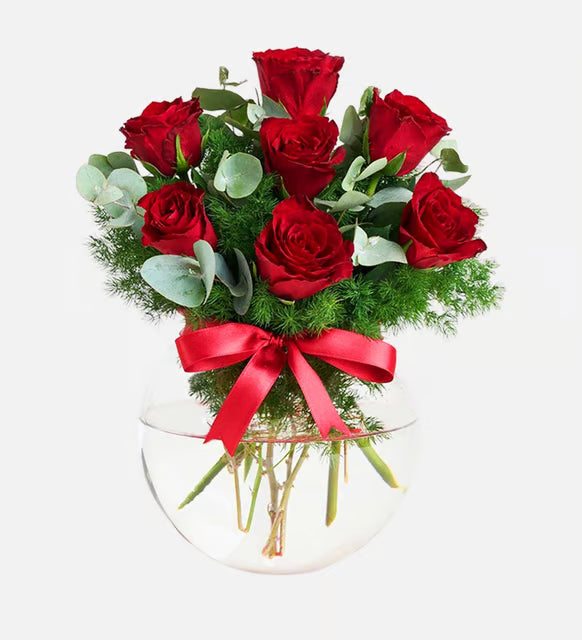 تتزين الورود الحمراء داخل مزهرية زجاجية أنيقة على شكل أكواريوم، مع لمسات من أوراق الأوكالبتوس التي تضيف انتعاشًا وجمالًا طبيعيًا للتنسيق. كل وردة حمراء ترمز إلى الشغف والعاطفة الصادقة، لتضيء يوم من تهديها له وتوصل مشاعرك بأرقى أسلوب.