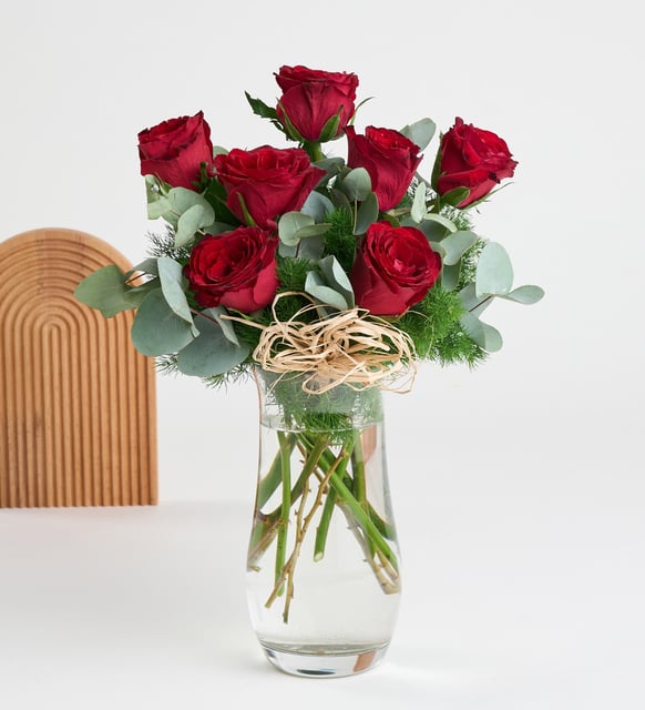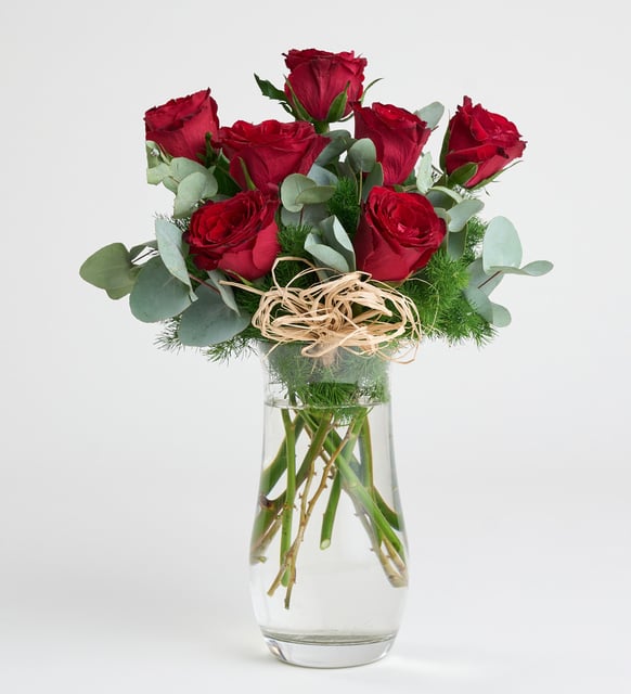 باقة 7 وردات حمراء مقدّمة داخل مزهرية زجاجية كريستالية أنيقة من توليبا ديليفري، هي الهدية المثالية التي تنطق بالحب والاهتمام والجمال في آنٍ واحد.